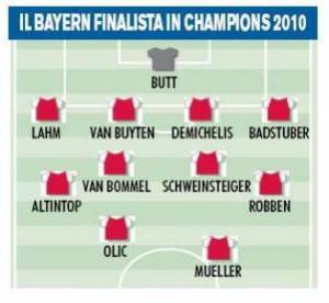 MADRID (Spagna) – Van Gaal, tecnico del Bayern Monaco, sembra aver scelto gli 11 giocatori che affronteranno l’Inter nella Finale del Santiago Bernabeu. L’olandese si affiderà ad un 4-4-2, con Altintop al posto dello squalificato Ribery, Robben a destra ed il duo d’attacco formato da Olic e Mueller. In difesa confermato Badstuber a sinistra. La probabile formazione secondo il Corriere dello Sport.