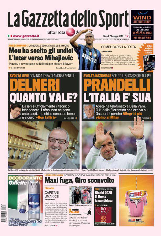 Sulla Gazzetta dello Sport uno dei temi principali riguarda la panchina della Nazionale italiana. Marcello Lippi lascerà la guida tecnica della Nazionale dopo i Mondiali ed il suo successore sarà Cesare Prandelli. Ieri la Figc ha avuto il via libera della Fiorentina che ha già trovato il sostituto, Gasperini del Genoa, mentre Allegri è più vicino alla panchina del Milan.