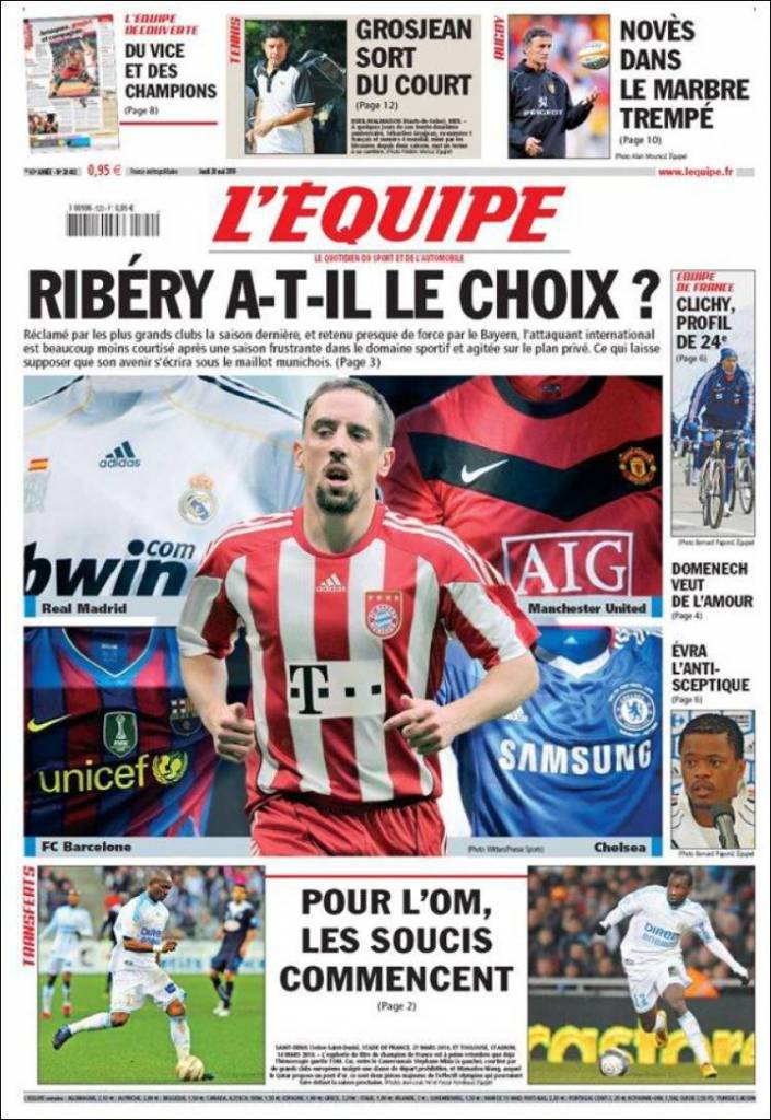 Sul quotidiano francese L’Equipe si parla del futuro di Frank Ribery, talento francese del Bayern Monaco. Sul giocatore transalpino ci sono le più grandi società del mondo, ovvero Manchester United, Chelsea, Barcellona e Real Madrid. Ieri in Germania i quotidiani tedeschi parlavano di una possibile permanenza al Bayern Monaco da parte del giocatore anche se Inghilterra parlano di un addio già annunciato.