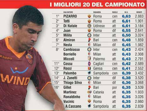 ROMA – Come riporta la tabella del Corriere dello Sport, il migliore giocatore del campionato, secondo i voti degli inviati, è il romanista Pizarro che ha preceduto Totti e Di Natale nella speciale classifica. Nei primi posti molti giallorossi mentre nei venti giocatori c’è spazio solo per tre giocatori dell’Inter Campione d’Italia. Un risultato per certi versi sorprendente. Ecco la classifica.