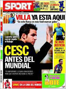Il quotidiano catalano Sport apre con il probabile acquisto di Cesc Fabregas da parte del Barcellona. Il presidente dei catalani Laporta chiede ai suoi dirigenti di acquistare il giocatore prima dei Mondiali sudafricani che potrebbe far lievitare ancora di più la valutazione del forte centrocampista dell’Arsenal. L’ostacolo maggiore è rappresentato dal manager dei “Gunners” Wenger.