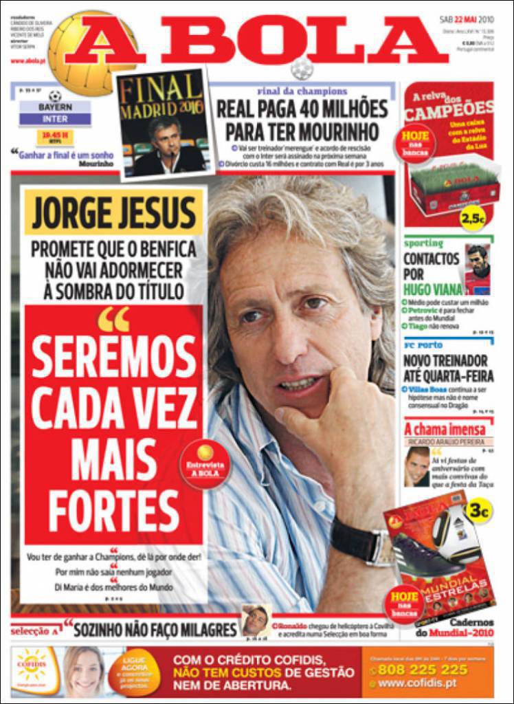 Il quotidiano portoghese A Bola parla del possibile ingaggio di Josè Mourinho da parte del Real Madrid. Si parla di un contratto da 10 milioni di euro all’anno per le prossime tre stagioni in più le “merengues” dovranno sborsare la clausola di circa 10 milioni di euro prevista nel contratto tra l’Inter e lo Special One per poter liberare l’allenatore nerazzurro dal contratto con la società milanese.