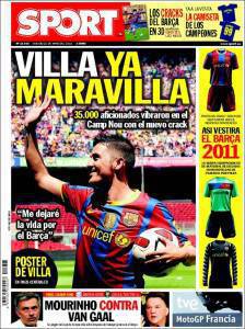 Il quotidiano catalano Sport parla del nuovo acquisto del Barcellona David Villa che ieri è stato presentato al Camp Nou con 35 mila tifosi blaugrana che lo hanno osannato. Il bomber della Nazionale spagnola, acquistato dal Valencia per 40 milioni di euro, si è già detto innamorato dei tifosi del Barcellona che lo hanno accolto come un re ed ha dichiarato di voler ricambiare questo affetto con tante reti.
