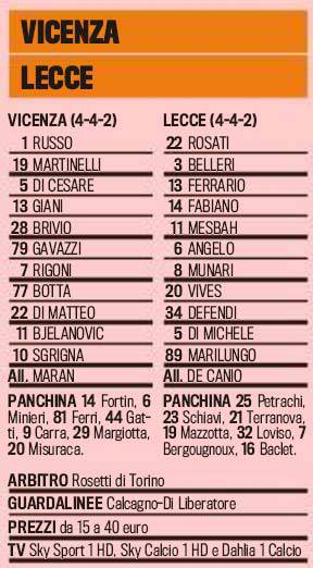 VICENZA – Quest’oggi c’è l’ultima giornata di Serie B, una si disputerà a Vicenza con il Vicenza che affronterà in casa i pugliesi del Lecce, i giallorossi se vinceranno o perderanno non cambia niente poichè sono automaticamente promossi in Serie A dopo un solo anno passato nella serie cadetta. Ecco le probabili formazioni della partita prese dalla Gazzetta dello Sport.