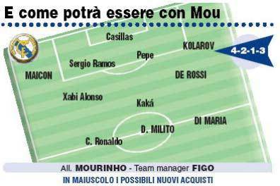 MILANO – ‘Tuttosport’ schiera oggi un 11 da sogno del Real Madrid, che con Mourinho in panchina cercherà di eguagliare le imprese dell’Inter di quest’anno. Almeno un paio dei colpi che vediamo sulla carta, molto probabilmente, andranno in porto, per una squadra che fa già sognare i tifosi dei ‘blancos’ e che preseguirà il duello infinito con il Barça…