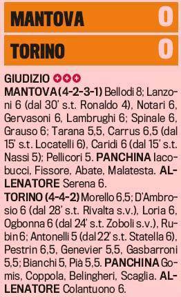TORINO – Ecco i voti della ‘Gazzetta dello Sport’ ai match di ieri di Torino e Lecce, le uniche tra le candidate alla promozione a non aver vinto, pareggiando entrambe per 0-0 in trasferta: tra i giallorossi buona prova del portiere Rosati, mentre i piemontesi trovano sulla loro strada un muro nel n°1 mantovano, addirittura da 8 in pagella…
