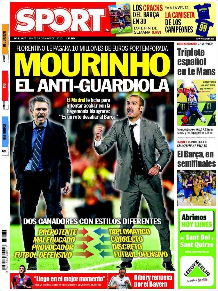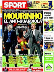 L’altro quotidiano catalano Sport “omaggia” Josè Mourinho ormai nuovo tecnico del Real Madrid definendolo l’anti Guardiola. Sotto ci sono tutte le caratteristiche del portoghese che mal si sposano con quella di Guardiola, il primo viene definito provocatore, maleducato, irrispettoso e difensivista, mentre il secondo incarna solo qualità positive. La sfida Barcellona-Real Madrid è già cominciata.