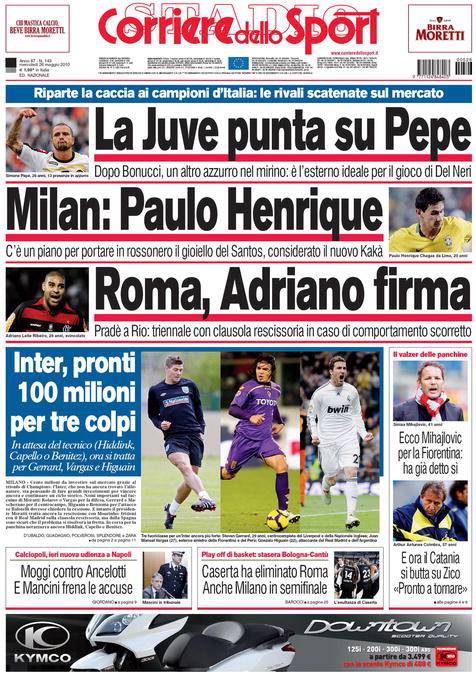 Sul Corriere dello Sport si parla del calciomercato della Juventus e del Milan. I bianconeri avrebbero individuato in Pepe dell’Udinese l’esterno giusto per il gioco di Delneri mentre il Milan vorrebbe portare a Milano Paulo Henrique, centrocampista offensivo del Santos che in patria considerano l’erede naturale di Kakà. A Roma è pronto a sbarcare Adriano.