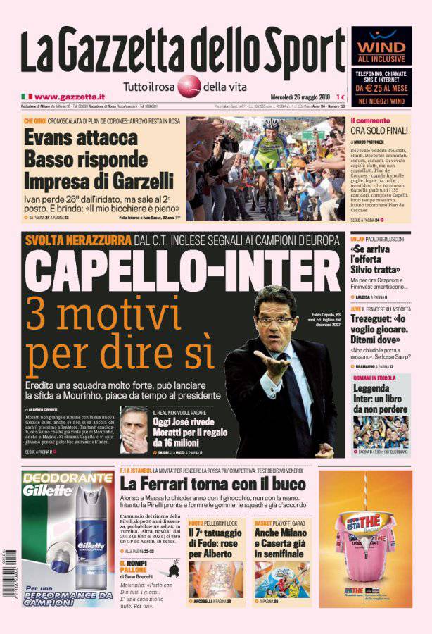 Sulla Gazzetta dello Sport si parla del possibile approdo sulla panchina dell’Inter di Fabio Capello, attuale c.t. dell’Inghilterra. Tre i motivi fondamentali che potrebbero spingere l’ex tecnico di Milan e Juventus ad accettare l’offerta di Moratti: potrebbe allenare una squadra già forte, lancerebbe la sfida a Mourinho e gode della stima del presidente Massimo Moratti.