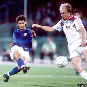 MILANO – All’inizio dei Mondiali sudafricani mancano ormai meno di 2 settimane: noi continuiamo a viaggiare con le immagini nelle passate edizioni, però, fermandoci per oggi ancora ad Italia ’90. Un nome, una garanzia. Roberto Baggio. La sua discesa e la sua finta prima della stoccata decisiva, nella partita contro la Cecoslovacchia, sono rimaste e rimarranno nella storia del calcio italiano…