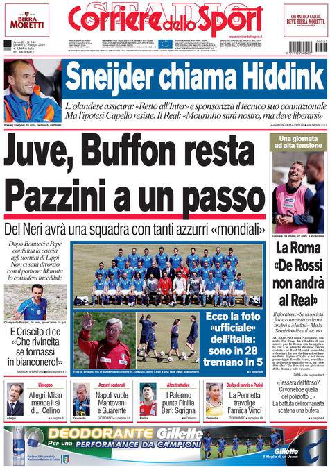 Sul Corriere dello Sport spazio al calciomercato della Juventus con la società bianconera che ha blindato il portiere Buffon. Sempre rimanendo in casa Juventus occhi puntati su Bonucci per la difesa, Pepe e Pazzini per l’attacco. La Vecchia Signora ha ormai deciso di puntare sul “made in Italy” con molti giocatori del gruppo Mondiale di Marcello Lippi. I bianconeri vorrebbero effettuare i tre acquisti prima del Mondiale.