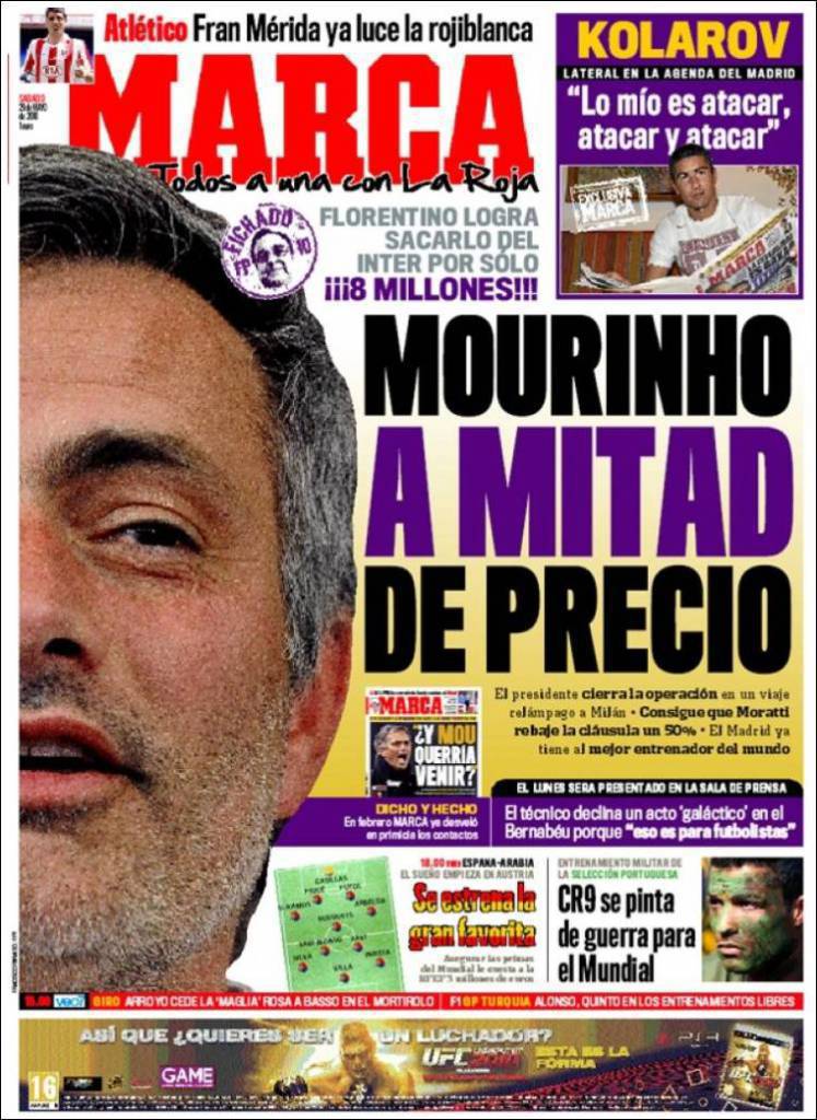 MADRID (Spagna) – Il quotidiano spagnolo Marca, molto vicino alle questioni relative al Real Madrid, tratta la questione dell’ingaggio di Josè Mourinho. Secondo il quotidiano, a discapito delle cifre di cui parlano i quotidiani in Italia, il Real Madrid verserà nelle casse della società di Massimo Moratti, “solo” 8 milioni di euro. La clausola rescissoria inserita nel contratto avrebbe, invece, previsto, per liberare il tecnico dal vincolo con i nerazzurri, il pagamento di 16 milioni di euro.
