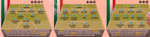 COVERCIANO – Oggi la Gazzetta dello Sport ha ipotizzato tre moduli che potranno essere adottati dal ct Marcello Lippi impegnato con la Nazionale italiana nei Mondiali di Sudafrica 2010 che comincieranno tra poco più di dieci giorni. Nella prima formazione possiamo notare l’Italia schierata con il 4-2-3-1, nella seconda invece con il 4-4-2 ed infine nella terza con 3-4-3. Ecco a voi la foto degli schemi con tutti i spiegamenti in basso alle foto.