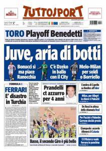 Il quotidiano torinese Tuttosport concede ampio spazio al calciomercato della Juventus. In difesa l’obiettivo principale è Bonucci del Genoa ma piace anche il “gemello” Ranocchia. A centrocampo potrebbe partire Felipe Melo destinazione Milan, in cambio dai rossoneri potrebbe arrivare Borriello o soldi. Per l’attacco si punta su Dzeko ma c’è da battere la concorrenza del Manchester City.