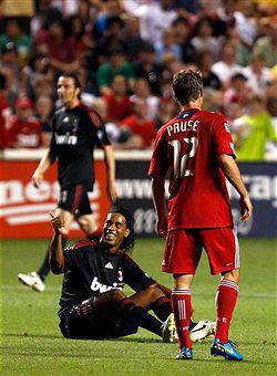 CHICAGO (Usa) – Scena a dir poco esilarante quella alla quale hanno assistito i tifosi presenti a Chicago 2 giorni fa, all’amichevole tra i Fire ed il Milan. Un invasore di campo (speriamo ubriaco) si è infatti lanciato sul rettangolo di gioco ed è corso senza indugi verso Ronaldinho, crollandogli ai piedi e baciandoli. L’esagitato ha poi abbracciato il brasiliano ed è stato portato fuori a braccia dalla sicurezza, poichè non voleva lasciare il ‘Gaucho’ di sua spontanea volontà…