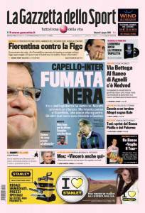 MILANO – La Gazzetta dello Sport apre con la trattativa per portare Fabio Capello sulla panchina nerazzurra. Secondo il quotidiano “rosa” il colloquio avuto fra capello e Moratti avrebbe portato ad un rifiuto da parte del c.t. inglese, che vorrebbe continuare la sua avventura oltremanica. Le alternative si chiamano Guardiola, Hiddink e Benitez.