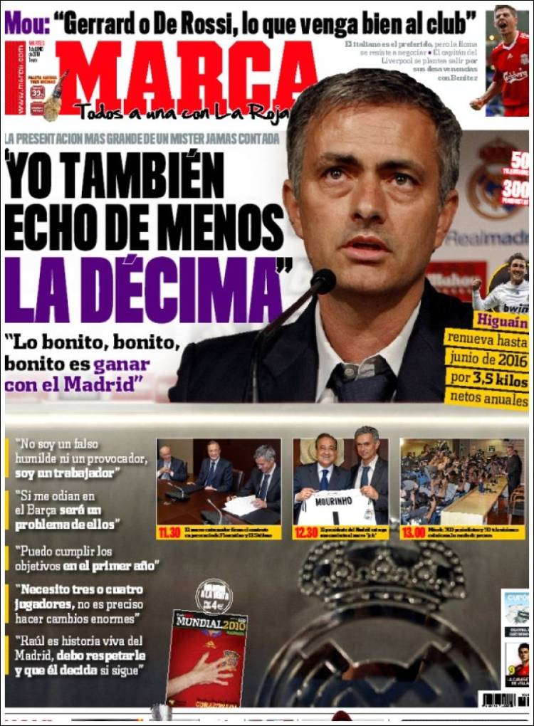 Sul quotidiano Marca ampio spazio alla presentazione di Josè Mourinho come nuovo tecnico del Real Madrid. L’ex trascinatore dell’Inter ha voluto ringraziare il gruppo di giocatori presenti in nerazzurro ma ha già dichiarato di voler portare a Madrid la decima Coppa dei Campioni, un traguardo che il club madrileno ha da tempo nel mirino. Si è parlato di mercato con lo Special One che ha in mente il nome di Daniele De Rossi.