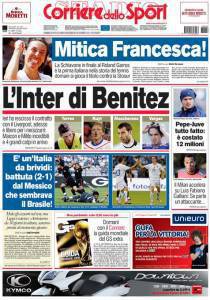 Sul Corriere dello Sport si parla già dell’Inter di Rafa Benitez. Ieri il manager spagnolo ha ufficializzato il suo addio dal Liverpool e nei prossimi giorni dovrebbe firmare il contratto con l’Inter. Intanto si parla già di calciomercato con Milito e Maicon dichiarati incedibili e l’arrivo di quattro grandi colpi: Torres, Mascherano, Kuyt e Vargas, tutti richiesti dal manager spagnolo.