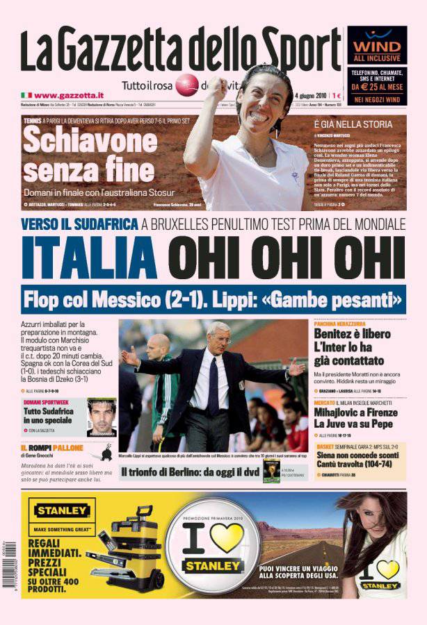 Sulla Gazzetta dello Sport si parla dell’amichevole di ieri sera tra Italia e Messico persa dagli azzurri di Marcello Lippi per due a uno. Nel penultimo test prima del Mondiale sudafricano, l’Italia zoppica vistosamente ed il progetto 4-2-3-1 con Marchisio trequartista naufraga dopo pochi minuti al cospetto di un Messico molto agile e ben messo in campo dal c.t. Aguirre.