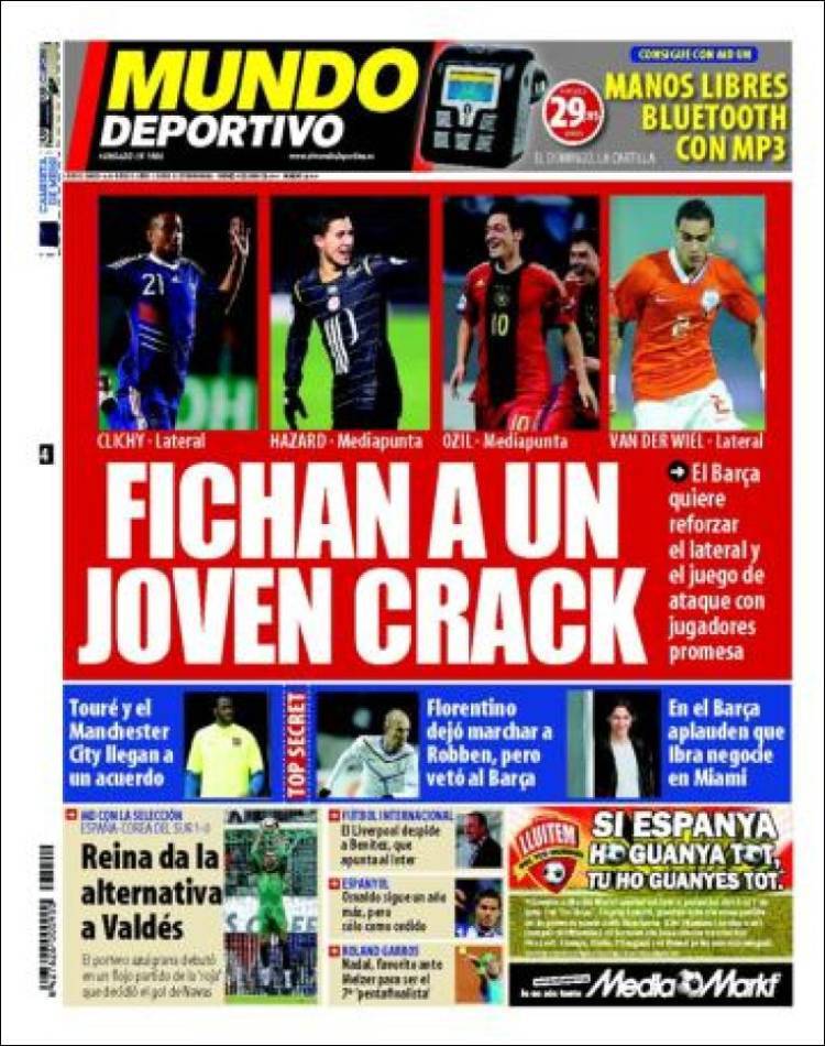 Sul quotidiano catalano Mundo Deportivo si parla del calciomercato del Barcellona. La società catalana ha messo nel mirino quattro talenti del calcio mondiale e cercherà di portare al Camp Nou uno di questi quattro giovani. Nel mirino ci sono Hazard, Van der Wiel, Ozil e Clichy, anche se si farà un tentativo pure per Robben del Bayern Monaco, anche se il Real Madrid cercherà di riprenderselo.
