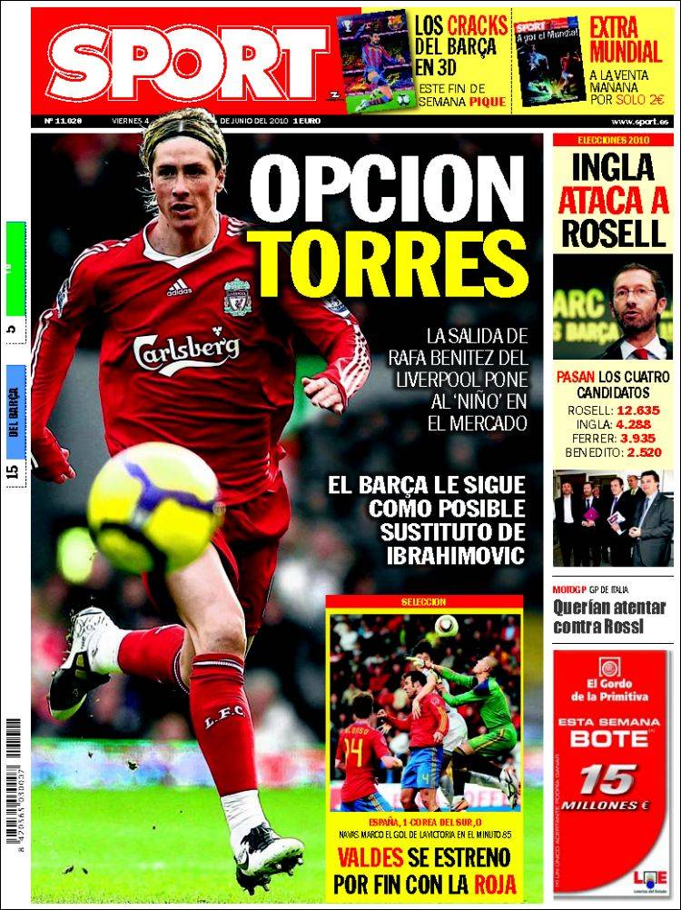Sull’altro quotidiano catalano Sport si parla sempre del calciomercato del Barcellona con i catalani che potrebbero puntare su Fernando Torres per sostituire Zlatan Ibrahimovic. Lo spagnolo dovrebbe lasciare Liverpool ora che il suo “mentore” Benitez ha abbandonato la società inglese. Tuttavia sullo spagnolo c’è anche l’Inter, probabilmente la futura squadra del manager iberico.