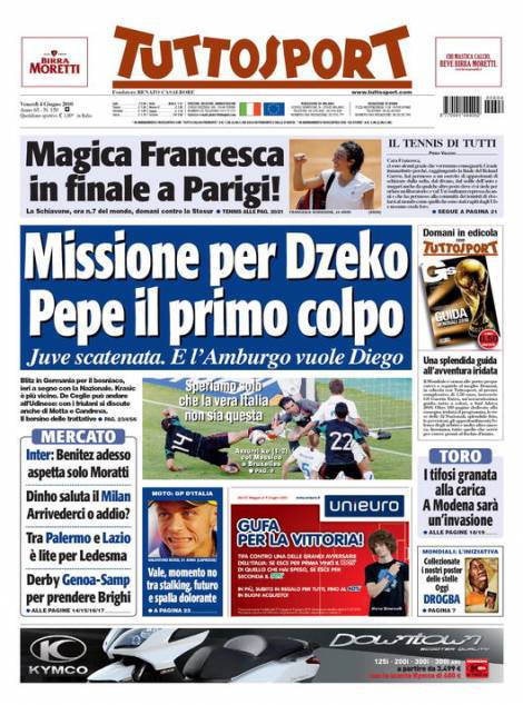 Sul quotidiano torinese Tuttosport si parla del calciomercato della Juventus con il nuovo dirigente Marotta sulle tracce di Edin Dzeko, bomber bosniaco del Wolfsburg a segno ieri nell’amichevole persa dalla Bosnia contro la Germania. Intanto potrebbe essere ufficializzato l’acquisto di Simone Pepe dell’Udinese, uno dei rinforzi primari richiesti da Delneri.