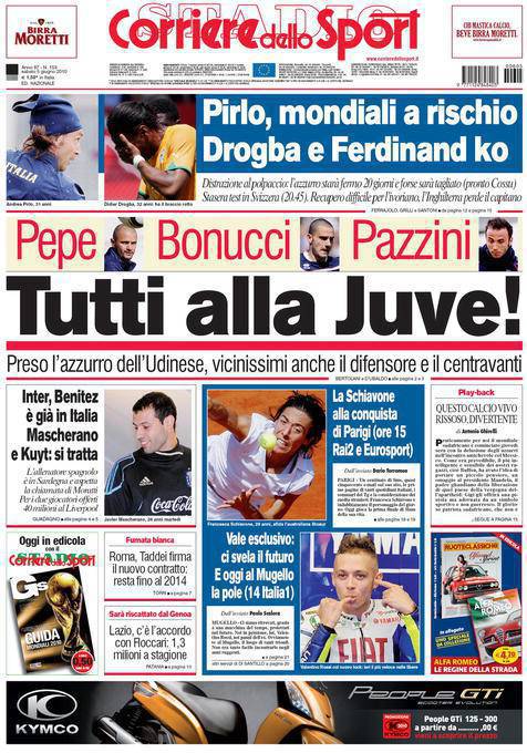 ROMA – La Juventus è pronta a tornare e grande e per questo come sottolinea la prima pagine del Corriere dello Sport, è pronta ad acquistare molti giocatori. Il primo acquisto bianconero potrebbe essere l’esterno d’attacco romano Simone Pepe in arrivo dall’Udinese. I prossimi due colpi potrebbero essere effettuati a breve, il primo nome è quello del difensore del Bari Bonucci ed il terzo nome è quello del bomber della Sampdoria Giampaolo Pazzini.