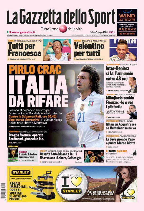 MILANO – Brutta perdita per l’Italia di Marcello Lippi che quasi sicuramente in questo Mondiale dovrà fare a meno di Andrea Pirlo che ha subito un infortunio e sembra che non ce la farà. Al suo posto il tecnico italiano sta già cercando un sostituto e sembra che il più indirizzato per la chiamata in Sudafrica è il cagliaritano Andre a Cossi che Lippi lo aveva già calcolato come prima riserva nel caso in cui qualcundo dei 23 convocati si sarebbe infortunato prima del torneo.