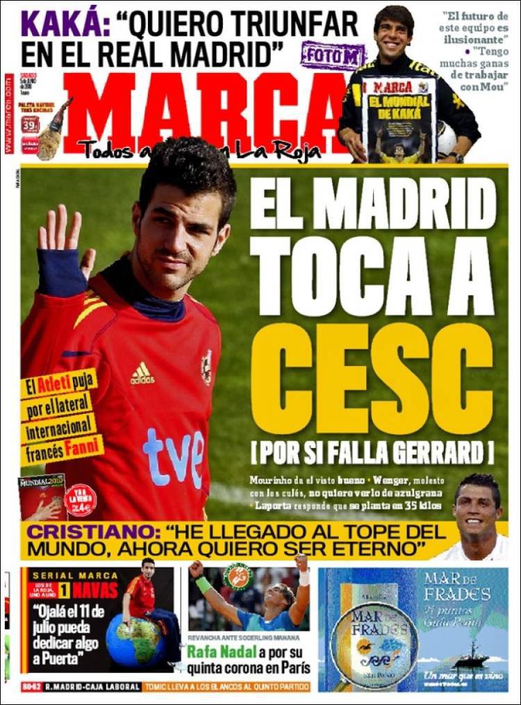 MADRID (Spagna) – Secondo il quotidiano spagnolo Marca, il Real Madrid è pronto a ricominciare un calciomercato faraonico come quello della scorsa stagione. Infatti come titola la prima pagine del quotidiano, possiamo leggere molti nomi di campioni: il sogno è Cesc Fabregas anche se l’alternativa sarebbe quella del centrocampista inglese Steven Gerrard. Intanto Kakà giura fedeltà al club dichiarando di voler trionfare con la maglia dei blancos.