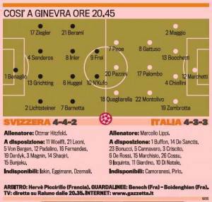 CITTA’ DEL CAPO (Sudafrica) – Questa sera ci sarà la seconda amichevole pre Mondiale dell’Italia contro la Svizzera, i nostri azzurri dopo la brutta prestazione contro il Messico cercano un riscatto immediato per far ricredere i tifosi più scettici sulla squadra e sui giocatori. La partita si giocherà in Svizzera a Ginevra alle ore 20.45 e l’Italia di Marcello Lippi scenderà in campo con un probabile 4-3-3, ecco le probabili formazioni prese dalla Gazzetta dello Sport.