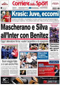 Il Corriere dello Sport apre con un titolo di calciomercato riguardante la nuova Inter di Rafa Benitez che quest’oggi firmerà un contratto biennale con la società nerazzurra. Il tecnico spagnolo ha chiesto l’acquisto dell’argentino Mascherano e dello spagnolo David Silva, il primo dovrebbe lasciare il Liverpool per circa 20 milioni, qualcosina in più servirà per strappare l’ala del Valencia.