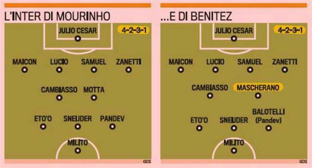 MILANO – Da Josè Mourinho a Rafa Benitez. L’Inter di Massimo Moratti volta pagina e per sostituire lo Special One si affida a “The Magician”. Nessuna differenza dal punto di vista tattico, anche lo spagnolo partità dal 4-2-3-1 di Mourinho con qualche differenza per quanto riguarda gli interpreti. Nell’undici di Benitez dovrebbe esserci Mascherano a far coppia con Cambiasso mentre in attacco fiducia a Balotelli. Ecco la foto della Gazzetta dello Sport.