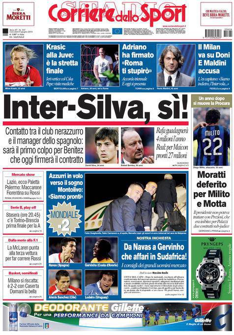 Sul Corriere dello Sport si parla del calciomercato della nuova Inter di Benitez. Il tecnico spagnolo oggi firmerà il nuovo contratto ed il suo primo acquisto sarà David Silva del Valencia, l’esterno spagnolo che lo scorso anno è stato cercato con insistenza dalla Juventus. Dopo lo spagnolo sarà il turno di Mascherano, pupillo del tecnico nativo di Madrid che ha già allenato al Liverpool.