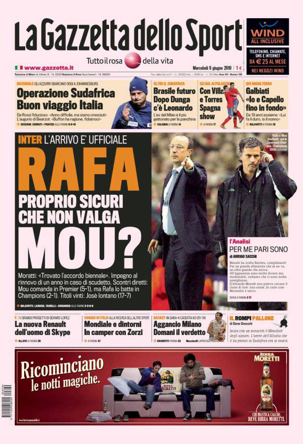 Sulla Gazzetta dello Sport si parla del nuovo tecnico dell’Inter Rafa Benitez. Il quotidiano “rosa” mette a confronto lo spagnolo con l’ex tecnico nerazzurro Josè Mourinho. Per quanto riguarda i trofei vinti lo Special One ha dieci punti di margine, mentre negli scontri diretti in Premier vede Mourinho avanti ma non in Champions. L’ex Liverpool ha firmato un biennale.