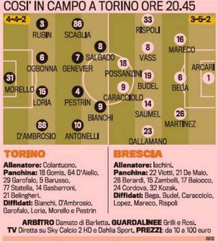 TORINO – Questa sera a Torino andrà di scena l’andata della finale di playoff di Serie B tra Torino e Brescia. I granata proveranno a tornare nella massima serie affidandosi alla coppia d’attacco Salgado-Bianchi, con quest’ultimo sempre più protagonista. L’avversario sarà il coriaceo Brescia di Iachini che in attacco si affiderà alla coppia Caracciolo-Possanzini. Ecco le probabili formazioni secondo la Gazzetta dello Sport.