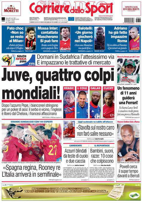 ROMA – Sempre attento al mercato il quotidiano romano. Oggi la prima pagina è dedicata alla scatenata Juventus di Beppe Marotta, pronta a chiudere quattro fantastici colpi: Krasic, Gallas, Clichy e Joe Cole. I quattro campioni saranno certi protagonisti in Sudafrica, dove cercheranno di guidare i propri paesi alla conquista del Campionato del Mondo.