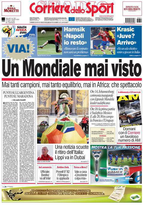 Anche il Corriere dello Sport apre con la grande manifestazione mondiale. Quest’oggi alle 14 cerimonia inaugurale a Johannesburg che aprirà ufficialmente i Mondiali sudafricani 2010. Una manifestazione storica mai così ricca di campioni e di novità, dove c’è molto equilibrio soprattutto per quanto riguarda la scelta del vincitore. Prima partita ore 16 Sudafrica-Messico.