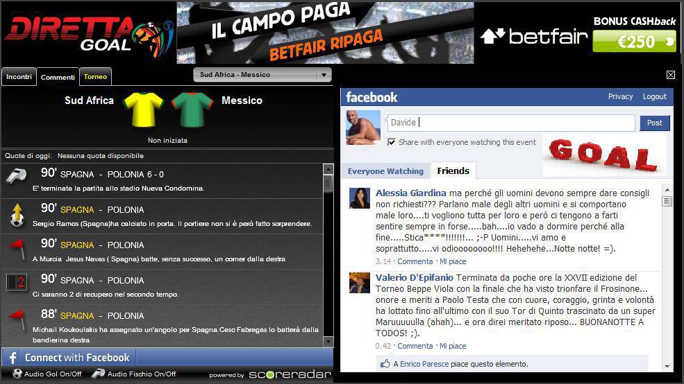 Poche ore al calcio d’inizio del mondiale sudafricano e Calciomercato.it non si fa trovare impreparata. Tante le novità per offrirvi un servizio quanto più valido possibile. Un’area dedicata interamente alla rassegna internazionale e un livescore di ultima generazione, che vi consentirà di rimanere collegati con il vostro social network preferito: dandovi l’incredibile opportunità di poter seguire a vostro piacimento la diretta della partita del momenti, rimanendo incredibilmente sempre connessi al vostro account su Facebook!