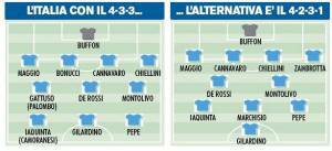 JOHANNESBURG (Sudafrica) – In questi giorni Marcello Lippi, c.t. dell’Italia, continua a provare la possibile formazione per il debutto Mondiale di lunedì sera contro il Paraguay. Oggi il Corriere dello Sport ha riportato i due moduli tattici provati da Lippi nel corso degli allenamenti: il primo è un 4-3-3 con Chiellini schierato come terzino sinistro e Pepe e Iaquinta ai lati del centravanti Gilardino. L’altro è un 4-2-3-1 con Chiellini al centro ed in attacco Gilardino supportato da tre trequartisti Pepe-Marchisio-Iaquinta.