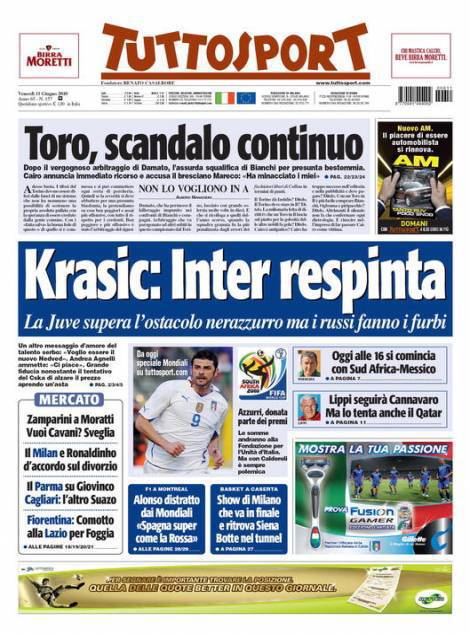 Il quotidiano torinese Tuttosport parla del calciomercato della Juventus con il tormentato affare Krasic. Il serbo del Cska Mosca è al centro di un intrigo tra la società russa, il Manchester City e l’Inter, anche se i nerazzurri hanno smentito l’interesse per il giocatore. Il problema è legato alla società russa che vorrebbe cedere il giocatore dopo i Mondiali per far aumentare il valore del cartellino.