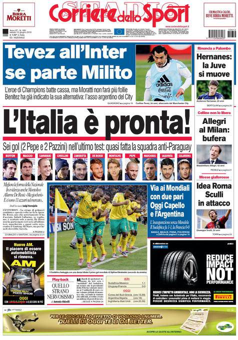 Anche il Corriere dello Sport apre con i Mondiali di calcio che lunedì serà vedranno il debutto della Nazionale italiana di Marcello Lippi che sfiderà il Paraguay. Il c.t. azzurro sembra aver scelto gli undici titolari che dovrebbero schierarsi con il 4-2-3-1, con Marchisio centrale sulla linea dei trequartisti e Montolivo al posto dell’infortunato Pirlo. In attacco confermato Gilardino.