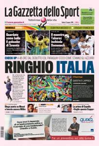 Sulla Gazzetta dello Sport si parla del Mondiale sudafricano che ieri ha preso il via con due pareggi. Il primo match tra Sudafrica e Messico è terminato uno a uno mentre nel secondo match l’Uruguay ha bloccato la Francia sullo zero a zero. Luned’ sera toccherà all’Italia con Marcello Lippi che potrebbe puntare sul centrocampista del Milan Gennaro Gattuso, uno dei più in forma tra gli azzurri di Lippi.