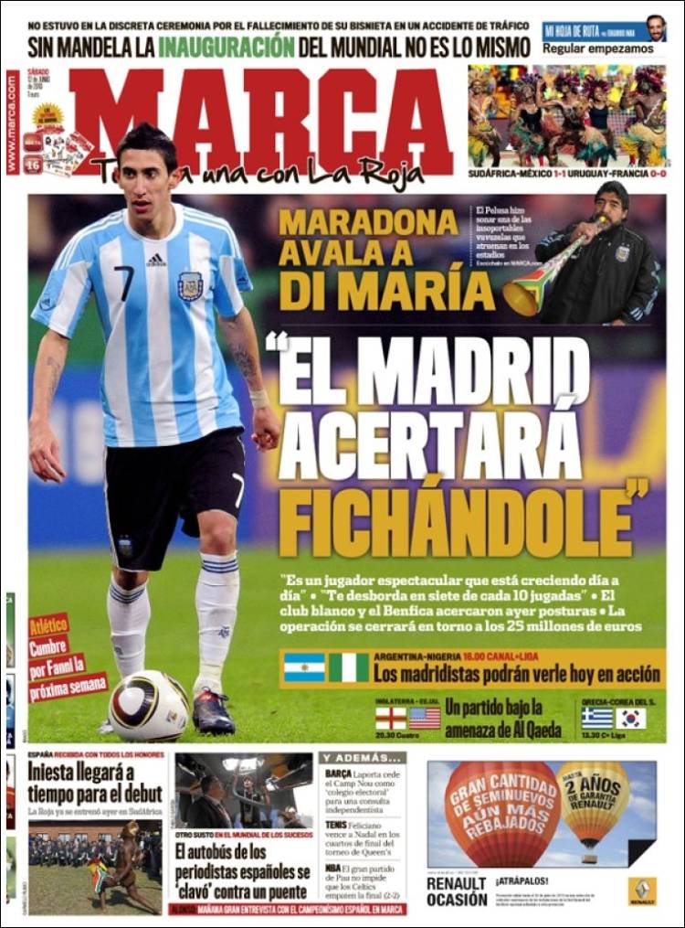 Sul quotidiano spagnolo Marca vengono riprese le dichirazioni di Diego Armando Maradona riguardo all’imminente acquisto di Di Maria da parte del Real Madrid. L’ex Pibe de Oro parla di un “giocatore spettacolare che è pronto per il grande salto di qualità, continua a crescere di giorno in giorno, questa volta il Real Madrid non sbaglierà con l’acquisto di Di Maria”.