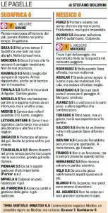 JOHANNESBURG (Sudafrica) – Ieri alle 16,00 si è giocata la prima partita del torneo dei Mondiali 2010 e la prima squadra a scendere in campo è stata la squadra ospitante del torneo, cioè il Sudafrica che ospitava il Messico. La partita è finita con un pareggio per 1 a 1 e la gara è stata abbastanza piacevole ed equilibrata, ecco le pagelle della partita prese dalla Gazzetta dello Sport.