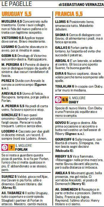 JOHANNESBURG (Sudafrica) – Partita noiosissima dalla quale però ci si attendeva qualche emozione in più quella di ieri sera del Girone A tra Uruguay e Francia che hanno regalato poco spettacolo ai tifosi. La partita è terminata a reti inviolate deludendo molto le aspettative che si facevano prima della partita. Ecco le pagelle della gara prese dalla Gazzetta dello Sport.