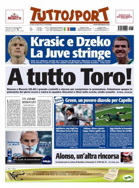 TORINO – Il quotidiano torinese Tuttosport si concentra sul Torino e sulla Juventus. Il club allenato da Colantuono si appresta, infatti, ad affrontare il Brescia di Iachini nella sfida di questa sera valida per la finale dei play off di Serie B. I piemontesi devono, per raggiungere la promozione in Serie A, assolutamente vincere, mentre ai lombardi potrebbe bastare anche un pareggio con qualsiasi punteggio. Spazio, in prima pagina, anche al mercato della Juventus, con l’esterno del Cska Mosca, Milos Krasic e l’attaccante del Wolfsburg, Edin Dzeko sempre più vicini.