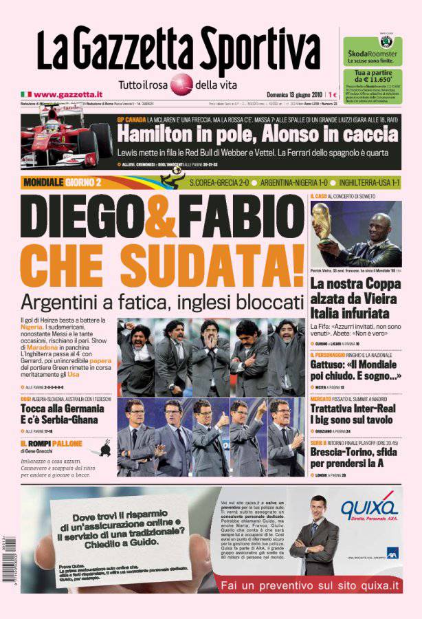 MILANO – Il quotidiano milanese La Gazzetta dello Sport si concentra sul Mondiale in Sudafrica sulle partite disputate dall’Argentina di Diego Armando Maradona e dall‘Inghilterra di Fabio Capello. I sudamericani hanno ottenuto una sofferta vittoria contro la Nigeria, grazie ad una rete del difensore Heinze. L’inghilterra non va oltre il pareggio per 1-1 contro gli Stati Uniti. Per gli inglesi il gol porta la firma del centrocampista del Liverpool, Steven Gerrard. Spazio anche alla Serie B, con Brescia e Torino pronte a contendersi la Serie A nella finale dei play off di questa sera.
