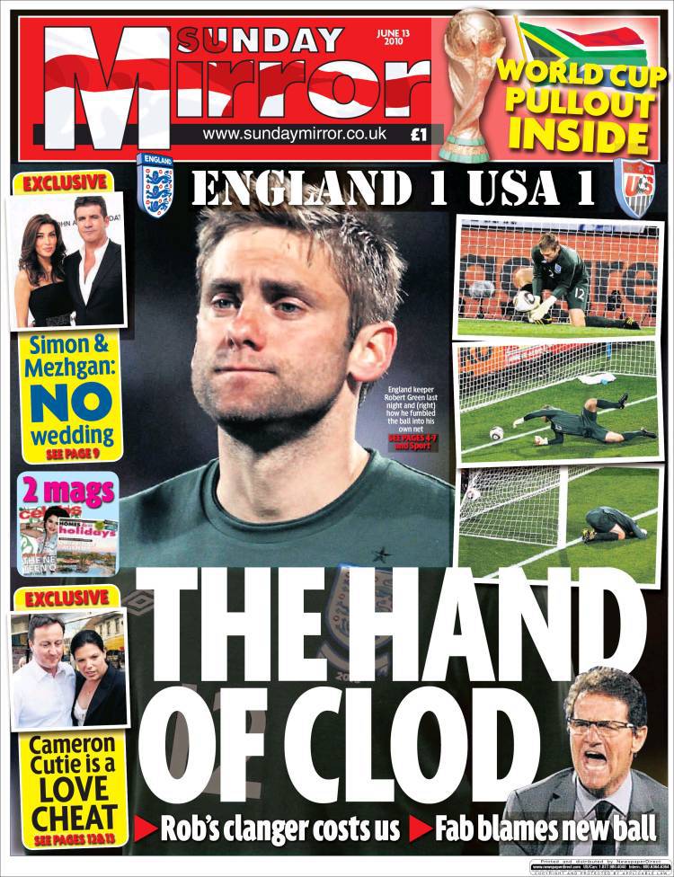LONDRA (Inghilterra) – Il tabloid inglese Sunday Mirror si cioncentra sul Mondiale in Sudafrica. L’Inghilterra, nel match di ieri sera contro gli Stati Uniti di Bradley, non è andata oltre il pareggio per 1-1. Decisiva è risultata la clamorosa papera del portiere dei britannici Green, che ha riportato la situazione in parità. L’Inghilterra era passata in vantaggio dopo pochi minuti grazie ad una rete di Steven Gerrard.