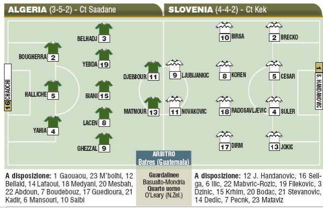 JOHANNESBURG (Sudafrica) – Oggi si gioca l’ultima gara del Girone C, dopo quella tra Inghilterra e Stati Uniti di ieri sera, oggi alle 13,30 tocca ad Algeria-Slovenia. Poi in serata ci saranno le due gare del Girone D con Serbia-Ghana e Germania-Australia a chiudere la giornata di Mondiali per oggi. Ecco intanto a voi le formazioni di Algeria-Slovenia, che saranno prossime avversarie di Capello nel girone, prese dalla Gazzetta dello Sport.