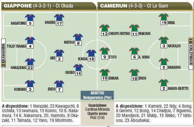 JOHANNESBURG (Sudafrica) – Il Camerun di Samuel Eto’o vuole seguire l’esempio del Ghana, unica nazionale africana a imporsi nella partita d’esordio. Gli africani dovranno sfidare una nazione in crescita, il Giappone di Honda e Morimoto. I pronostici son tutti per il Camerun, ma il Mondiale, si sa, è pieno di sorprese.